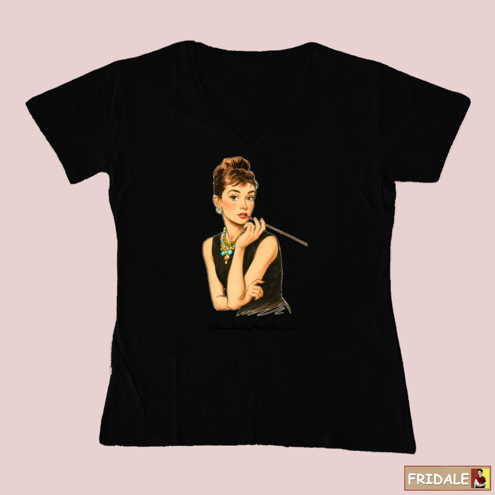 חולצת אודרי הפבורן בעיצוב צבעוני אלגנטי – זמינה בלבן או שחור, בגזרת V לנשים או עגול יוניסקס. סמל הסטייל הנצחי עכשיו גם עלייך, או כמתנה למישהי יקרה לך.