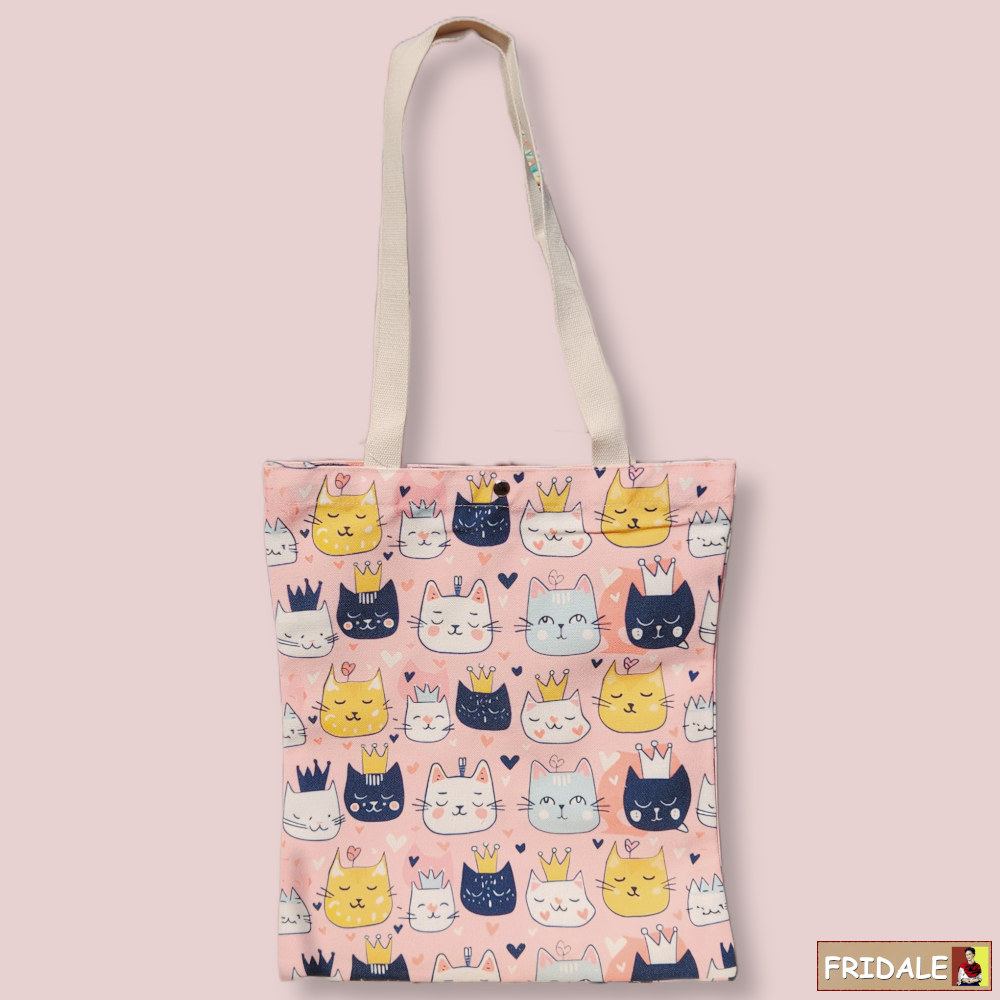 תיק ורוד משגע עם הדפס חתולים מלכותיים וכתרים. עשוי קנבס איכותי, דו־צדדי, קל ועמיד.