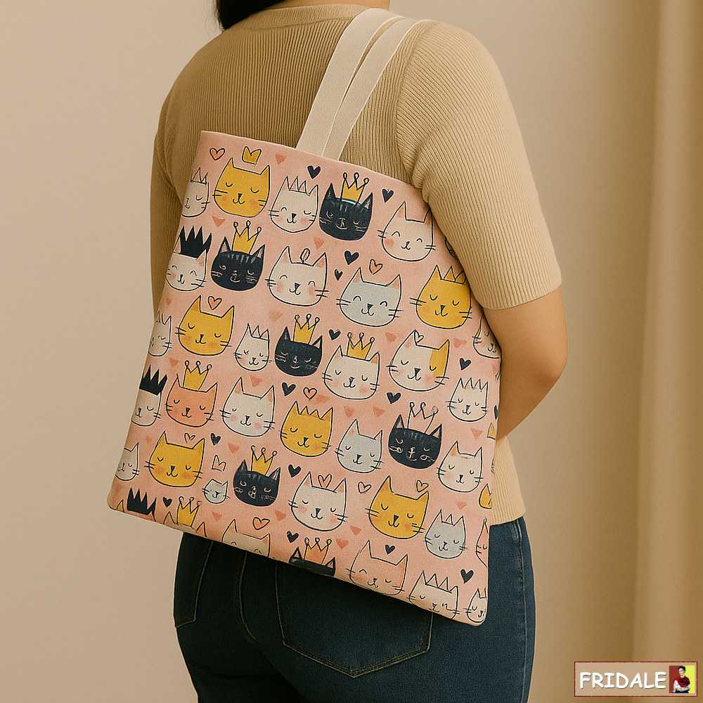 תיק דו־צדדי מבד קנבס איכותי, עם הדפס מקורי של עשרות חתולים חמודים, על רקע ורוד אופטימי נעים.